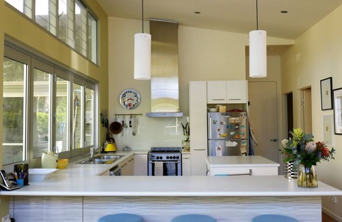 The kitchen is FULLY equipped for preparing gourmet, family feasts or intimate dinners. You can even pick your own fresh, seasonal herbs from the garden. Alternatively, you can opt for a casual BBQ (Weber Family Q) on the back decks. The dining room table can seat 8, whilst the breakfast bar seats 3 and the outside table and chairs, accommodate 6 people. Spare deck chairs and drinks table are also provided. The brand new washing machine and dryer are concealed in the beautifully conceived, second bathroom.