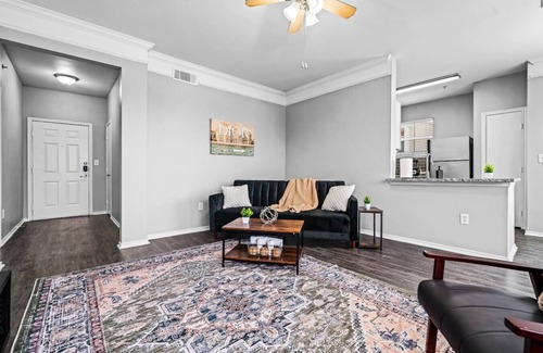 Relax in this stylish 2-bedroom apartment just 9 miles from downtown Fort Worth. Enjoy resort-style amenities, including a sparkling pool, lounge area, and a blue basketball court. Stay active in the fully equipped fitness center. The apartment features spacious interiors, modern decor, and all the essentials for a comfortable stay. Perfect for families, friends, or business travelers seeking convenience and comfort. Book now for an unforgettable Fort Worth experience!