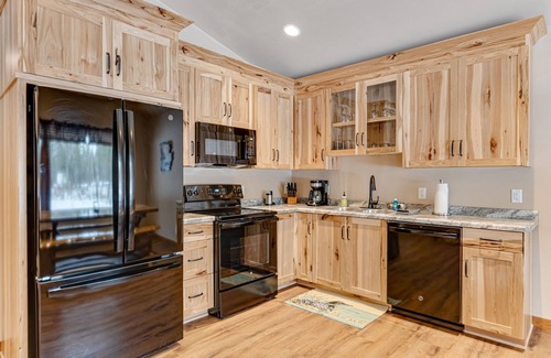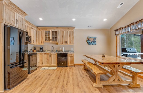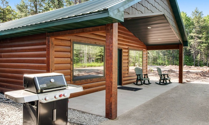 Inside both cabins, you'll find bright, welcoming interiors and a cozy atmosphere throughout the well-appointed living areas, all blanketed in natural light. Relax and make yourself at home by resting on the plush furniture, streaming movie marathons on the large TVs, or curling up in the glow of the grand stone fireplaces. The open-concept floor plans were designed with togetherness in mind so that no conversation would be lost here. Create culinary charms and snacks for your outdoor adventures in the sophisticated eat-in kitchens, equipped with brand-new appliances, ample cupboard room, and rustic dining tables. Host barbecues, serve cocktails, or sip your morning coffee on the patios while listening to the tranquil sounds of nature, and then gather around the firepit as the stars come out.