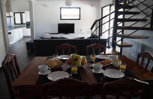 Modern house, 210 m2, which can accommodate up to 10 people, including a large living room with open kitchen in the central island. Living room and dining room.