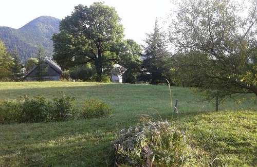 Very nice view of the Vercors opposite. Large unfenced garden + forest, hut and small stream.