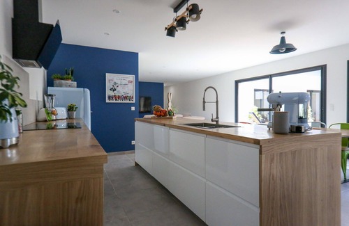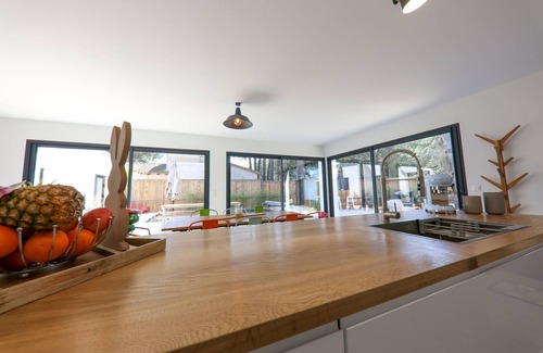 A large kitchen counter totally open to the living room and the outside. Giving direct view on the pool. Fully equipped: Large induction hob, fan-assisted oven, dishwasher, fridge/freezer combo, toaster, kettle, SMEG coffee machine...