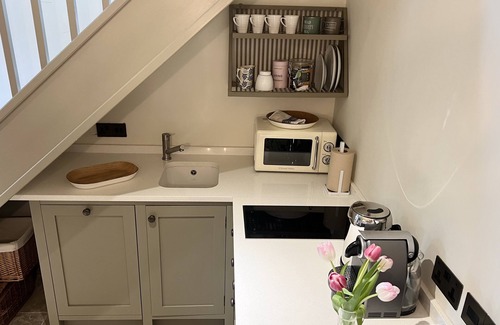 The Kitchenette is fully equipped for your stay with a Nespresso coffee machine, 2 ring electric hob, fridge with small freezer box, kettle and slimline dishwasher. There are kitchen essentials provided to prepare breakfast and light meals if desired.