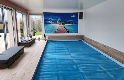 NEW 2022: Indoor swimming pool from July 2022. Size 6m x3 m with corner stairs and 4 massage jets. A large terrace facing south, along the length of the pool.