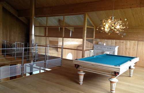 Spacious and bright contemporary wooden house on 5,000 m² of land including 4 bedrooms on the ground floor (4 bedrooms with double bed, 2 bathrooms, 2 bathrooms, fully equipped American kitchen, indoor pool heated all year round and billiard room on the mezzanine. View of Chartres Cathedral. A pretty home to discover absolutely without delay for a weekend with family or friends. Non smoking area.