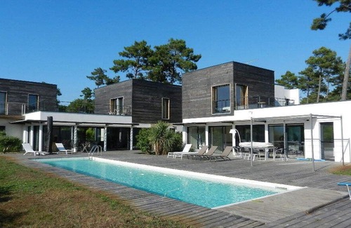 IN AN EXCEPTIONAL FRAMEWORK FACING THE FOREST, we offer a magnificent double contemporary style villas, composed of two living rooms with two open kitchens, 6 air conditioned bedrooms each with a bathroom, 5 toilets, large swimming pool (15x4) usable from June to September, 2 tennis available in the area - huge wild beach 1 km, village CONTIS-BEACH 10 minutes by bike - many bike paths in the forest - many activities in summer.