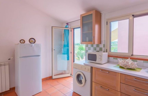 3-room apartment 85 m2, on the ground floor. Living/dining room with 1 double sofabed and satellite TV (flat screen), fan. 2 double bedrooms, each room with 2 beds (140 cm, length 180 cm), fan. Open kitchen (4 hot plates, oven, microwave, freezer). Exit to the terrace. 2 showers/bidet/WC. Heating (extra). Heating available only from 01.11. to 31.03. Large terrace. Terrace furniture. Facilities: washing machine, mosquito net, hair dryer. Internet (WiFi, free). Maximum 2 pets/ dogs allowed. There are 3 steps between the living room and the kitchen. IT068012B54WHNI76B