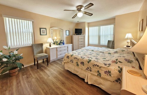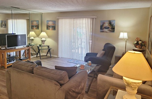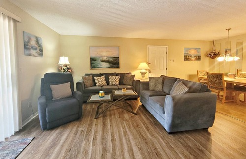 You'll quickly discover this serene, ground floor, 2 bedroom / 2 bath condo, which sleeps 4 is perfectly situated on a quiet cul de sac and is just 100 yards from the community clubhouse. Its full equipped kitchen (refrigerator, oven/stove, microwave, dishwasher, coffee maker, blender, electric mixer, cookware, plates, bowls, glasses, utensils and much more are provided) is everything you'll need to make home cooked meals. New vinyl flooring installed has replaced all carpet! Its living room features a 40 inch flat screen cable television, DVD player, stereo, recliner chair, coffee table and new sofas. From the living room you can take a short step outside into the screened-in patio room where you can relax and enjoy the natural serenity. To add comfort, the patio features a ceiling fan, blinds, carpet, table and chairs. Master bedroom features a king size bed, which can be split into (2) double sized beds for separate sleeping. Master features a 26" flat screen cable TV, free secure wifi, ceiling fan, alarm clock, landline phone, private bathroom with shower / tub and walk-in closet. Guest room includes (2) double beds, ceiling fan, closet and alarm clock. Guest bath includes shower and tub. NEW washer and dryer inside unit. Welcome home! :)
