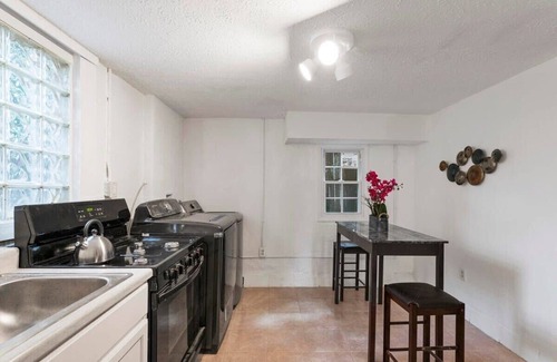 This cozy 2-bedroom, 1-bathroom daylight basement apartment features white brick walls, a lower ceiling, and an industrial ambiance for a hip, modern feel. The apartment comfortably sleeps 6-7 people, including the convertible sofa. The well-appointed kitchen includes a dishwasher, washer, dryer, and high-top table. Enjoy the lovely covered porch with patio seating. The unit comes with one off-street parking space and offers easy street parking for additional cars.
