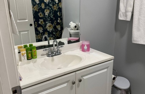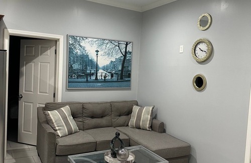 Sparkling white floor with two large bedrooms with two king beds. Each room has its bathroom. Guest has private driveway and entrance to the basement unit. Clean bedsheets are provided. Hair dryer, electric iron. Each room has its own television
