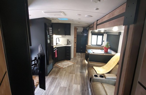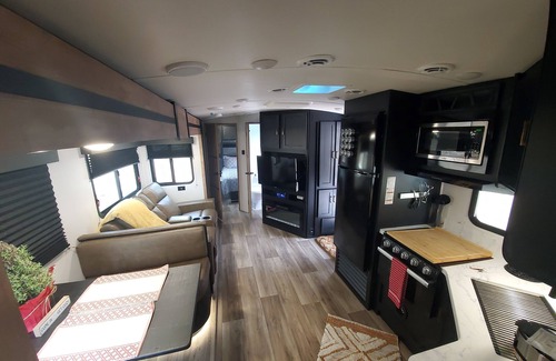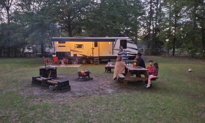 Located just 30 miles from the sites of Savannah, our spot is prime for both exploring adventures in the hostess city while enjoying the simple comforts of country living. Nestled beyond an oak lined entrance, your private space tucked away at the back of 1.60 acres of wide open space awaits you. Expect mornings with the eastern blue birds and robins and count on relaxing evenings inside the state of the art RV on the fireside recliners or outside by the flames of the crackling fire pit.