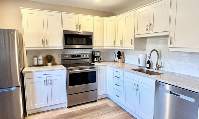The kitchen is fully equipped and thoughtfully designed for your stay. You'll find modern stainless steel appliances, including a full-size refrigerator, stove, oven, microwave, and dishwasher. The space is stocked with all the essentials—cookware, dishes, utensils, a toaster, and a drip coffee maker. Ample counter space and updated cabinetry create a clean, functional layout perfect for both quick breakfasts and longer stays.