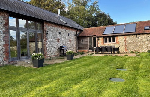 Orchard Barn is luxurious self catering accommodation, situated just off the South Downs in an area of outstanding natural beauty. Orchard Barn is just a few miles from the historic city of Chichester and many attractions including the Goodwood Estate with its Horse Racing, Festival of Speed and the Revival, the historic Dock yard at Portsmouth and the Isle of Wight to name a few. Orchard Barn is a beautiful converted Sussex flint barn with unique views of the downs and the surrounding area. There are many walks right on your doorstep and some challenging cycle rides for the more adventurous. Outside the barn are two patios with garden tables and chairs and a gas BBQ. There is under-floor heating throughout the ground floor of the barn. The hot water is heated by solar panels and we have also installed a rainwater harvester which is used to flush the toilets. The garden is fenced so it is safe for small children and dogs to roam.
