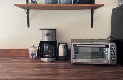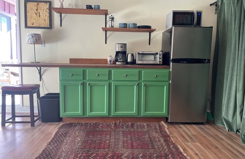 A converted garage, this 350 sq ft space has a queen bed & private living space. The bathroom is located inside the house. You do have to take 5 steps outside to get into the house to get to your bathroom. In the images you can see the garage entrance & house entrance. The bathroom has a bathtub. There is outside space in front of the room that guests can enjoy. The area includes a bench a table, a funky little propane bbq and a garden area. The room has a coffee / tea bar with a fridge, coffee maker, electric kettle, microwave, toaster oven and some basic cook ware. But guest are also welcome to use the house kitchen for sink access and to use the stove/oven if guest wish to do more elaborate cooking. This located 2 min, from the freeway. 15 min. to Ojai, less than 10 to beaches and down town Ventura. 2 minutes from swimming holes on the Ventura River. We are a few minutes out of town so it is quite with easy street parking and country dark at night.