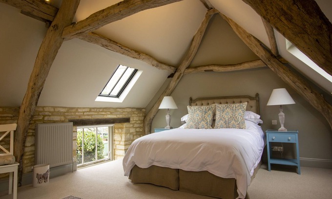 Upstairs under the eaves, with their original lime-washed oak beams and exposed Cotswold stone walls, are 4 heritage double glazed conservation windows, fitted with black out blinds for the light early mornings. The king sized double bed occupies one end of the bedroom while a generous cupboard sits at the other end with hanging rails for your clothes and space for your bags. All the upstairs lighting controls are conveniently located next to both sides of the bed.