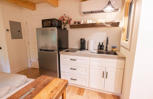 The kitchen boasts top-of-the-line appliances, allowing you to whip up meals to savor on your private deck. A spacious bedroom awaits you in the upstairs loft, with a luxurious king-sized bed dressed in sumptuous linens. The large windows offer unobstructed views of the starry night sky and the lush forest.