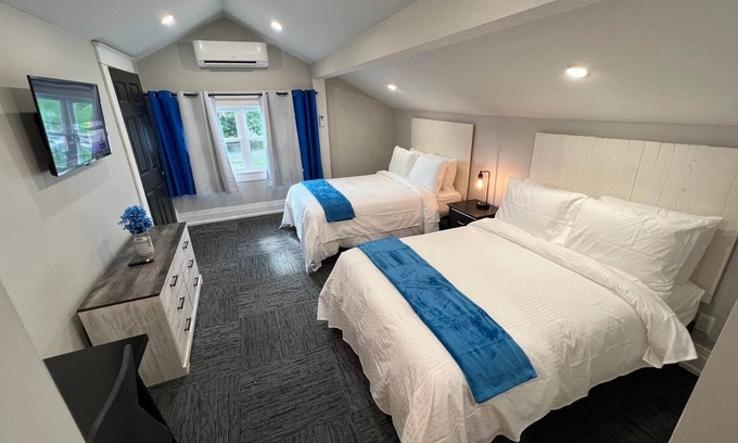 Possibly our cutest room, the Cookie Monster room is 285 square foot and features two double (full) size beds, 39" HDTV with Hulu Live & Netflix, sitting area, walk in closet, and full size shower with bench and glass door.