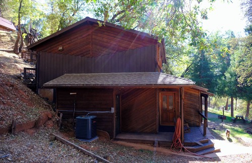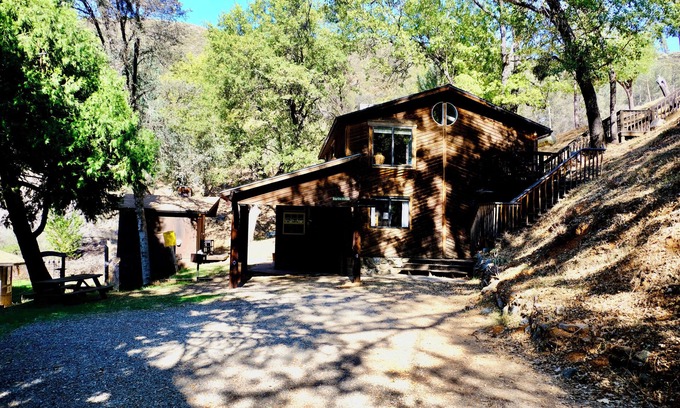 This 70's Hippie House is under some oaks near Highway 140 going towards Yosemite. It has a stocked kitchen, dining area with living area and a bathroom on the top floor. Below it has two bedrooms, a small bathroom, a laundry room and an enclosed porch. Most of the decor is original 70's with some newer, some antiques and owner's items. The large screen TV is set up for streaming. Outside is an upper deck and a smaller camping type charcoal BBQ area and a swinging bench.