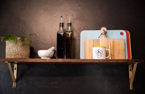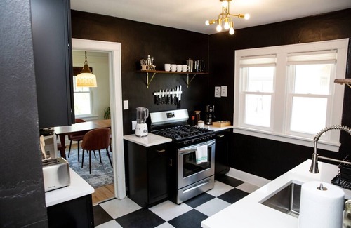 The kitchen is sleek and modern with black cabinetry, brass fixtures and stainless steel appliances. It is loaded with everything you need. Love coffee? We do! We provide a couple different ways to make coffee. We have a drip machine or you can use the large stainless steel french press. At our coffee station you'll find sugar (and non-sugar sweeteners), and creamers. We also provide a grinder for whole bean do it yourselfers. Enjoy a variety of different teas as well because we love tea too.