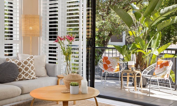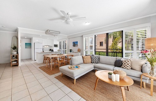 Your light-filled open plan living area extends on to a wrap-around, covered balcony overlooking a lush private garden courtyard. A modern kitchen with all the usual amenities integrates with the spacious dining area and a large L-shaped sofa is perfect for relaxing with a book. Floor to ceiling plantation shutters provide a laid-back tropical feel.