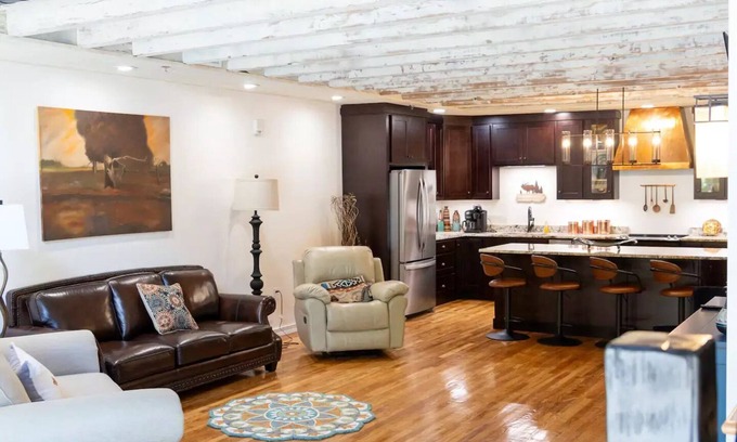 Finally ready! Completely renovated 100+ year old building. We brought back the 20' wide arch window that had been removed, added frenchdoors and a balcony to overlook the beautiful downtown Glasgow Square! A very unique and spacious property. Just walk out the door to food, shops and fun! Enjoy everything you need to spend a night or a few weeks. Make this your hub to tour south central Kentucky! Need more space, book in conjunction with The Plaid Peacock! 15 mins Mammoth Cave/Barren River
