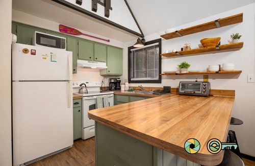 The open, spacious great room includes a dining area and living room with a wood-burning fireplace. Two large patio doors open to the spacious deck in the trees - perfect for fixing dinner on the gas grill and relaxing around the gas fire table. The kitchen includes updated appliances and is conveniently located adjacent to the great room and dining area and includes basic cookware, tableware, appliances, and a basket-style drip coffee maker (filters provided, but please bring your favorite grind). The dining area seats four at the table and another two at the kitchen bar. The main floor also includes two bedrooms, one with two twins and the other with a queen bed, and renovated full bathroom. The spacious loft looks out through the great room's huge windows and has one queen, a quiet reading nook, and it's own balcony. A stacked washer & dryer unit is in the main floor queen bedroom. Sleeps six comfortably.