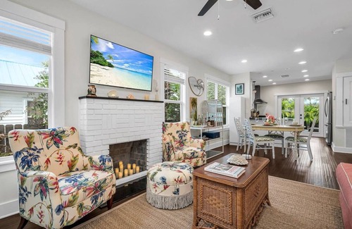The living room exudes vibrant personality with its thoughtful design. You'll find a beautiful sofa, two striking armchairs accompanied by matching poofs, and a large smart streaming TV for entertainment. Adorned with stunning artwork and battery-operated candles nestled in the decorative fireplace, the space radiates warmth and charm. Coastal décor accents and a collection of captivating coffee table books add to the inviting ambiance.