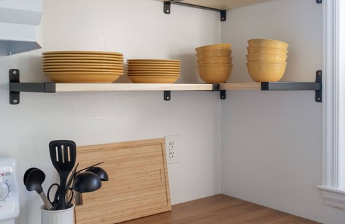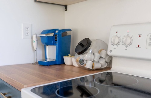 The first floor of the home consists of a fully stocked kitchen with everything you need to cook meals, a dining room, 1/2 bath, and living room with smart TV, record player, and games for entertainment.