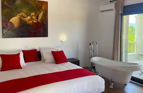 – 1 master bedroom with king size bed, Jacuzzi next to the bed, A/C, Smart TV, private balcony with sea view and garden view, en-suite bathroom.