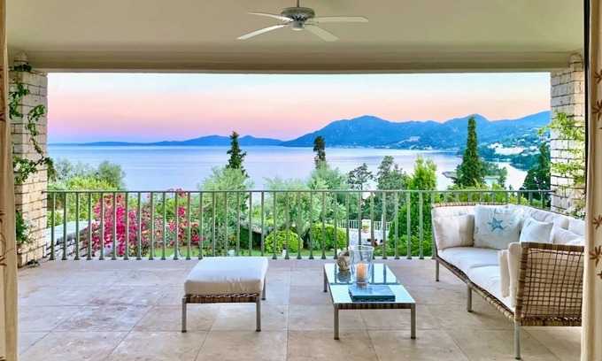 The grandeur of this luxury holiday home rental, gardens and the vast span of unobstructed views over the Ionian sea are incomparable. Manicured lawns and ornate flowering shrubbery are ever present. There is a multitude of dining spaces leaving you wondering where to take your next delicious meal, opting to choose a new spot each time according to the view that suits your present mood. The interior is refined and stylish and rooms blend easily from one to the next. Moroccan marble floors, summery coloured furnishings, and huge sliding glass doors, which pass out of sight into the walls, instantly create an ambiance of outdoor living.