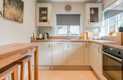 This contemporary, dual aspect kitchen has been very cleverly designed to include all the equipment and appliances needed for a self-catering stay. In addition, there is a bar table with two high stools and a recessed worktop with USB charger sockets where guests can sit and use a laptop while on a workation or planning a day's outing.