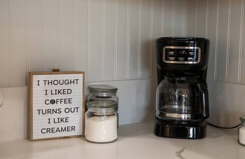 -Kitchen is complete with a refrigerator, stove, oven, and coffee maker.