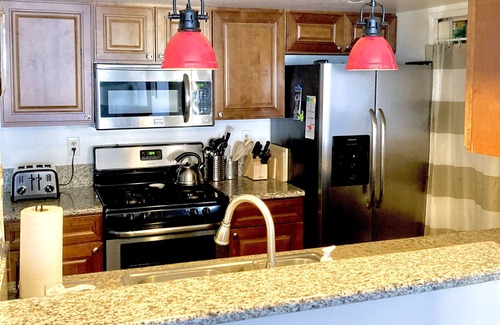A fully equipped kitchen, updated with stainless steel appliances, coffee maker, toaster, blender. Granite countertops in kitchen. You can cook all of your meals here. Designer porcelain tiles throughout. Central A/C and forced air heat. Large master BR suite with walk-in closet. Stacked washer and dryer. High-speed internet with free wifi. Living room has 46" LCD HD flat screen TV. 42" LCD TV in master BR. Cable over internet is provided on both devices. Linens and towels provided for your convenience.