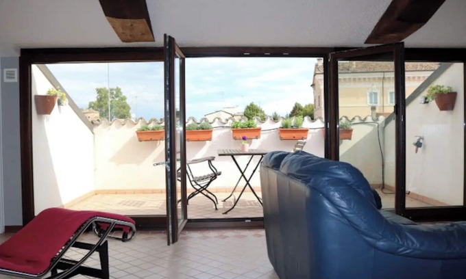 Attic in the historic center, in the main street of Ravenna, in the pedestrian area. In the heart of shopping, very close to the main monuments: San Vitale (180mt), Galla Placidia (250mt), Tomba di Dante (500mt), reachable on foot. Three-room apartment completely available to guests, with two bedrooms (double and single), large living room with kitchenette, bathroom, terrace with views of San Vitale. Possibility baby bed and bike rental. Elevator, air conditioning, wifi.