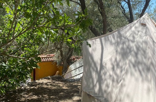 There are two areas - the main house with three bedrooms and the glamping tents with their own beautiful kitchen and bathroom area near the pool. One tent has single beds on a frame and the other has comfortable large single mattresses on the floor. Each tent is positioned under shady olive trees and look out onto the pretty terraces. Please note that the bell tents are up from April to the end of October.
