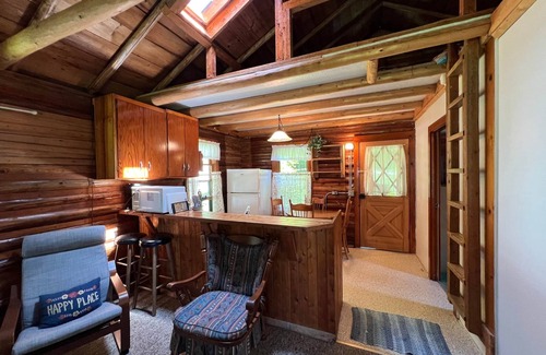 Combination Kitchen/Dining/Living Room: Whip up delicious meals with ease in the fully equipped kitchen while enjoying the rustic charm of the cabin.