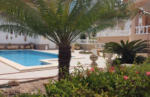 This large villa with private pool is set on a small exclusive hillside development just outside San Miguel de Salinas village with its selection of restaurants. It is surrounded by Almond and Citrus Groves and has award winning golf clubs nearby. It is a15 mins drive from Campoamor and Mil Palmeros beaches, 30 mins to Mar Menor, the famous 42km promenades lagoon with its beautiful sand and famous mud baths. La Zenia Boulevard is 15 mins drive and has a wide selection of shops. Campoamor, Las Ramblas, La Finca and Mar Menor golf courses nearby. Murcia Airport is 45 mins by car and Alicante Airport 55 mins away.