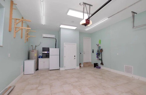 4 Bikes, 2 double kayaks and ping pong table in finished AC garage.
