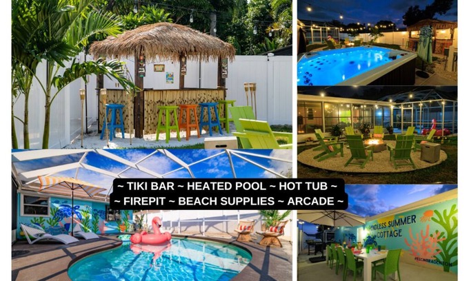 Endless Summer Cottage – Ultimate Coastal Escape Close to Anna Maria Island w/ Tiki-Bar, Heated Pool, Hot Tub, Firepit, Arcade, Games, Beach Equipment, Pack-n-Play, High-Chair, Toddler Bed