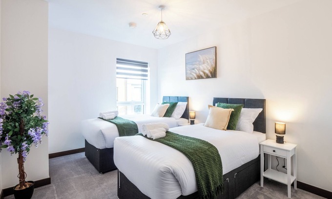 Welcome to our stylish 2-bedroom apartment in Harlow (CM20 2UF), just steps from Harlow Town Station! Ideal for commuters, families, and business travelers. Both bedrooms feature super king-size beds, which convert into 4 singles, plus a sofa bed in the living room, sleeping up to 6 guests. Enjoy a fully equipped kitchen, free Wi-Fi, smart TV, and fresh linens. Close to shops, restaurants, and transport links. Book now for a comfortable and convenient stay!