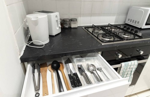 The fully equipped kitchen has essentials for home cooking, while the inviting living space ensures relaxation.