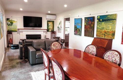 Take it easy at this unique and tranquil getaway. 3 bedroom house built in the 1960 that has been recently renovated. Large country style kitchen and adjoining living room. Features indoor fireplace, reverse cycle air conditioning and laundry facilities. Great views of the Barrabool Hills from the living room, verandah and lawn area. The Cottage is located at Barrabool Maze Estate.