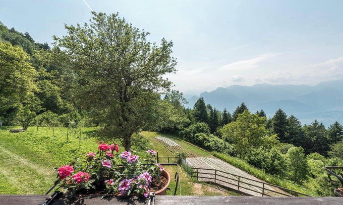 The rustic holiday apartment Baita Velo is situated on a mountain with a wonderful view, between Arco and Ronzo, in a idyllic, secluded location. The charming apartment is located on the 2nd floor and consists of a living room, a well-equipped kitchen, a double bedroom as well as one bathroom and can therefore accommodate 2 people. Amenities also include a TV, board games and children's books. From the private balcony of the accommodation you have a fantastic view of the garden of the property, which enchants with its lush greenery and makes you forget the stress of everyday life. The centre of Arco is 12 km away and the village of Ronzo, where you will find supermarkets, bars and restaurants, is 5 km or a 9-minute drive from the accommodation. Due to the ideal location of the property, the mountains Monte Stivo and Monte Creino are only 6 and 3 km away respectively. Especially mountain bikers and hikers will enjoy exploring the many paths and viewpoints. In Nago-Torbole (Torbole sul Garda) you will find the closest beach (18 km).