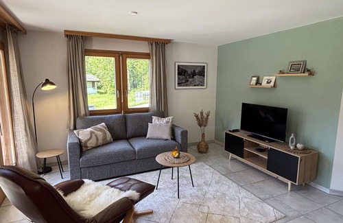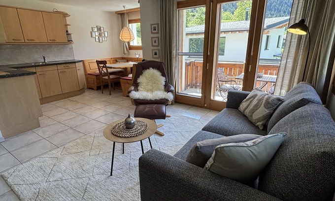 The apartment features a spacious living and dining area with a comfortable sofa corner, dining table and fully equipped kitchen. A separate bedroom with a double bed and a sofa bed in the living room provide space for up to three people. The bathroom is equipped with a bathtub with shower function. A shared storage room is available for sports equipment. A balcony with a view completes the offer.