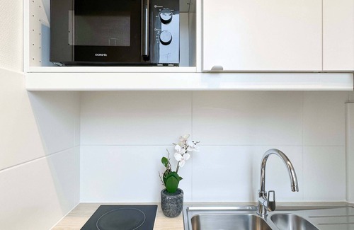 The apartment features a bedroom with a queen-size bed for two people and extremely comfortable new bedding, a bathroom with shower and toilet, storage space, a fully-equipped kitchen, and a lounge area with a convertible sofa for 2 people and a smart TV.