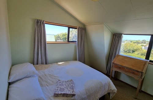You'll find this bach tucked away in a quiet, secluded gardens, boasting mountain and sea views. This three-bedroom bach is clean, comfortable and retro style. It is warm and cosy with a fire and heat pump. There are 3 bedrooms, 2 queen beds and a double, perfect for a small family, a few friends or a couple. Outside there's covered outdoor areas with BBQ. There's a drive big enough for 2-3 cars or bring the boat and garage to store your surfboard, boogie boards and bikes.