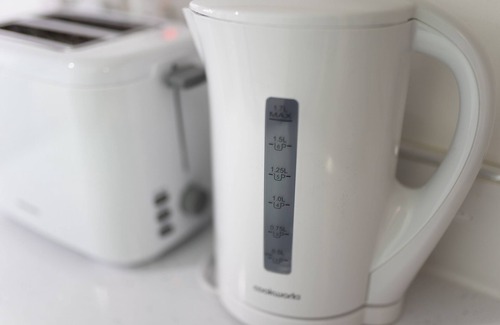 The fully equipped kitchen has an electric hob, fridge, a sink, a kettle and a microwave.