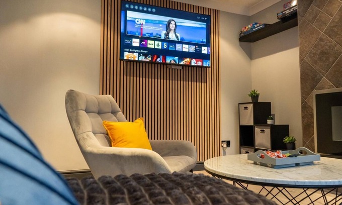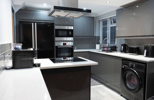 Welcome to your peaceful home away from home—modern, cosy, & tucked in a quiet neighbourhood. Enjoy a relaxing soak in the jacuzzi bath or a refreshing waterfall shower. With 2 double beds, a comfy sofa bed, smart TV in the master, and a fully equipped kitchen w/ coffee machine, you’ve got everything you need. The garden’s perfect for unwinding, or firing up the BBQ and there’s space for 2 cars on the drive.