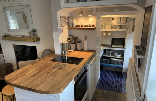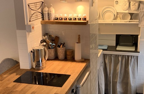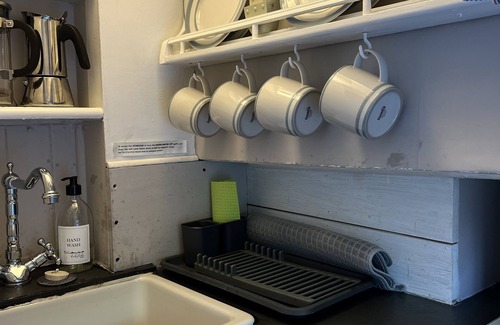 A cute little kitchen area with a two ring halogen hob, oven and fridge with freezer compartment. Don't forget to 'duck' as you step down in to the tiny scullery, with a little Belfast sink and draining area. Toaster, crockery and baskets for utensils and storage.
