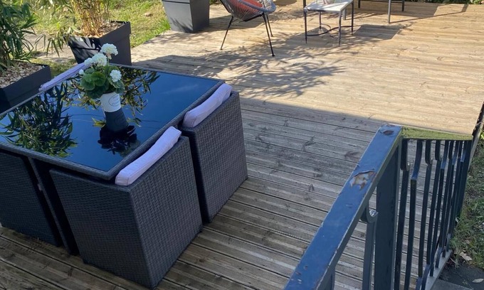 Relax on the deck or patio (enjoy the outdoor furniture!) of this apartment. For a change of scenery, come inside and enjoy the free WiFi and TV.